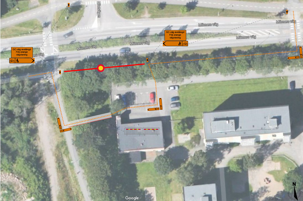 - Gående och cyklister hänvisas till en tillfällig gång- och cykelväg för att kunna passera Mörners väg från eller till Höstvägen. Följ skyltningen i området och var extra uppmärksam i trafiken.