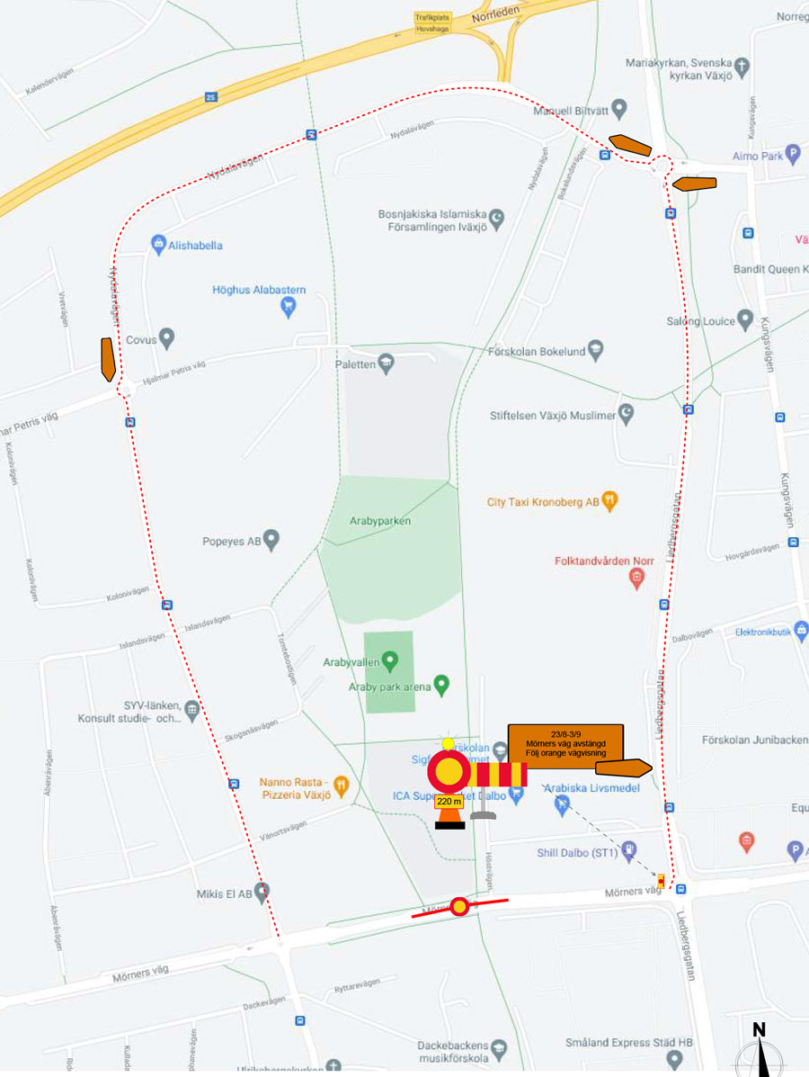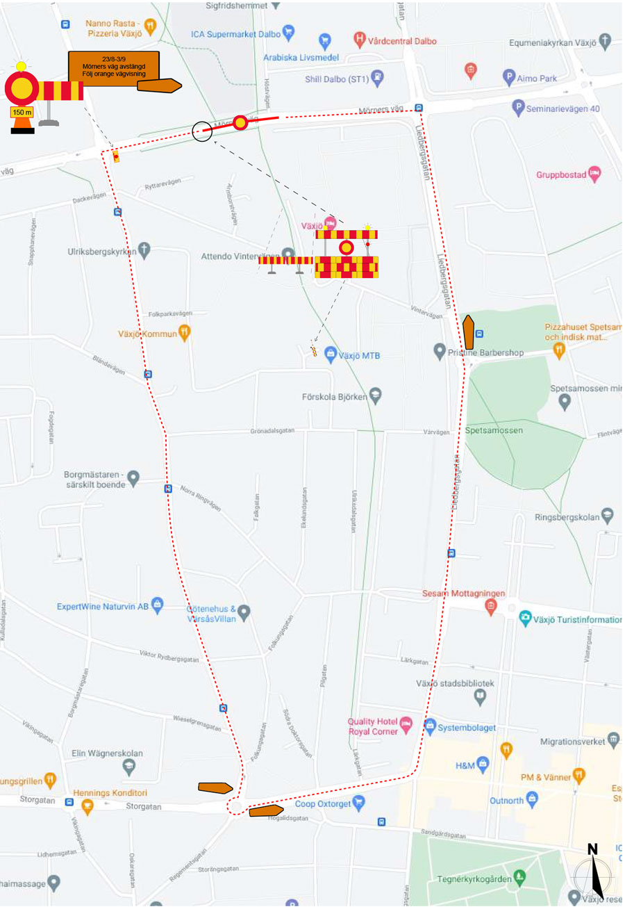 - Boende och företag i området hänvisas till en tillfällig väg för att komma till sin bostad eller arbetsplats. Följ skyltning vid Dalborondellen.